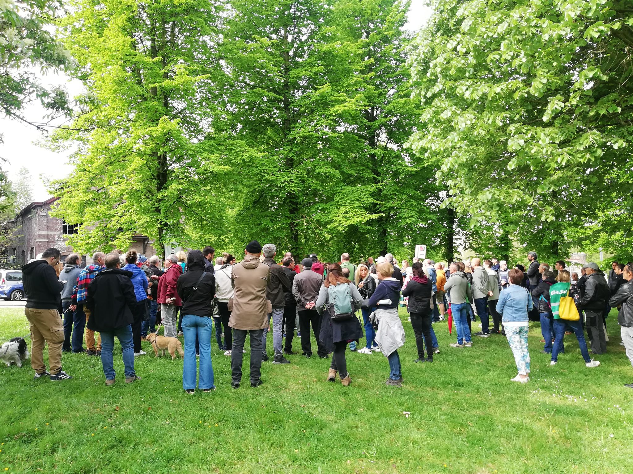 ... afin de réagir et mobiliser les citoyens suite à l'annonce de la construction des 22.000 m² de bureaux dans le bois, rue du Monastère à Seraing. Le lieu du rassemblement n'a pas été choisi au hasard car à l'arrière-plan de l'endroit où se sont succédées les prises de paroles se trouve un des immeubles les plus amblématiques de notre combat, visible par tous et dont l'état d'abandon et de décrépitude sont flagrants (anciennes tailleries).